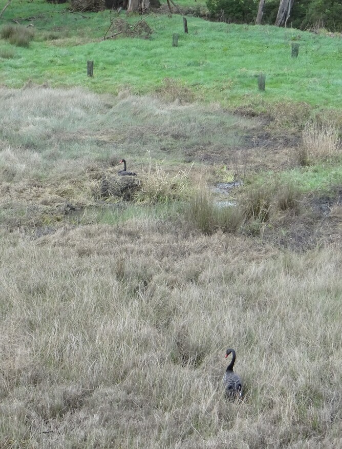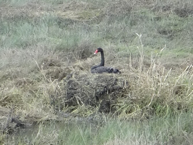 In mid-August Landcare members noticed a pair of swans were nesting on a large water weed nest in the middle of the swamp just north of the new pedestrian underpass on the Great Southern Rail Trail. They are not far from the very noisy trucks and roadworks construction site shown above but seemed to ignore it all.