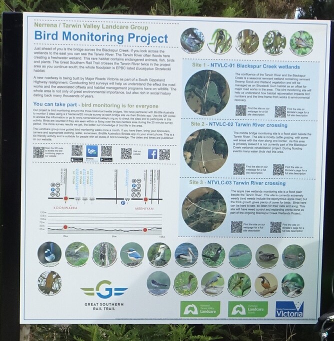 Anyone is able to monitor the birds they see by searching for the Birdlife Australia App or using the QR code which is on the sign by the Blackspur Creek Bridge on the Great Southern Rail Trail. On the sign we have photos of some of the more common birds seen.